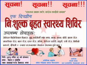 शिविरमा जेनेरल फिजिसियन विभाग, मुटु हार्डजोनी तथा नशा, नाक कान, घाँटी, छाला रोग, मानसिक रोग, बाल रोग, दन्त रोग, आँखा, जेनेरल सर्जरी, प्रशुती, स्त्री रोग, भिडियो एक्सरे, एसिजि र ल्याव लगायतका सेवाहरु उपलब्ध हुने समाजसेवी तथा सामाजिक ब्यक्तित्व खनिमायाँ श्रेष्ठले बताउनुभयो ।